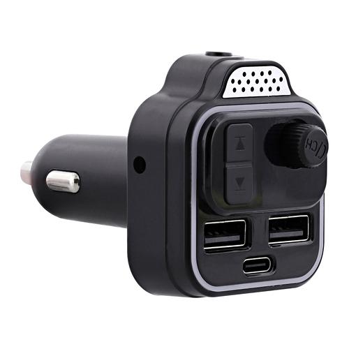 Transmetteur FM Bluetooth kit mains libres et charge rapide Permet une écoute de la musique et des appels sur les haut-parleurs du véhicule - Gestion de la musique, du volume et prise d'appel directe via boutons intégrés - Branchement sur prise allume-cigares et appairage avec l'autoradio du véhicule - Fonction de recherche automatique des stations libres de droit intégrée - Connexion du transmetteur possible avec d'autres appareils via Bluetooth, jack 3,5mm, clé ou câble USB - Permet la charge d'un mobile en simultané via 2 ports USB dont un port USB 18W - Port de charge turbo USB-C 30W - Anneau de couleur lumineux réglable - Bluetooth 5.0 - Clé USB 64G max - Coul. noir
