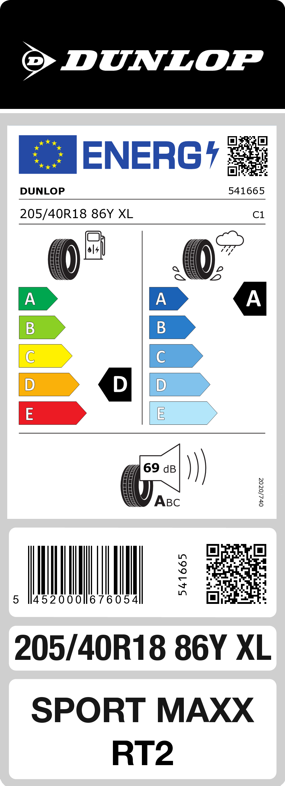 Pneu DUNLOP Sport Maxx RT2 205/40R18 86Y XL